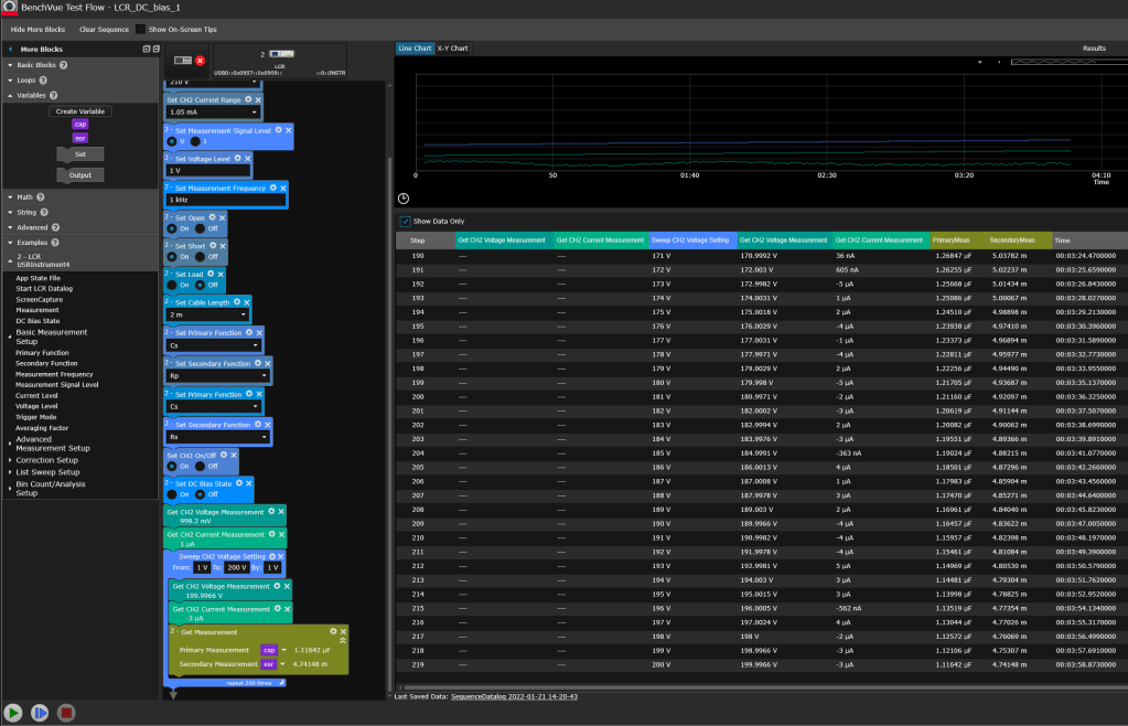 As for software, I used Keysight Benchvue to program the SMU and LCR meter to work in sequence to apply the DC bias, make an LCR measurement, increase the bias by +1 volt, make another LCR measurement.