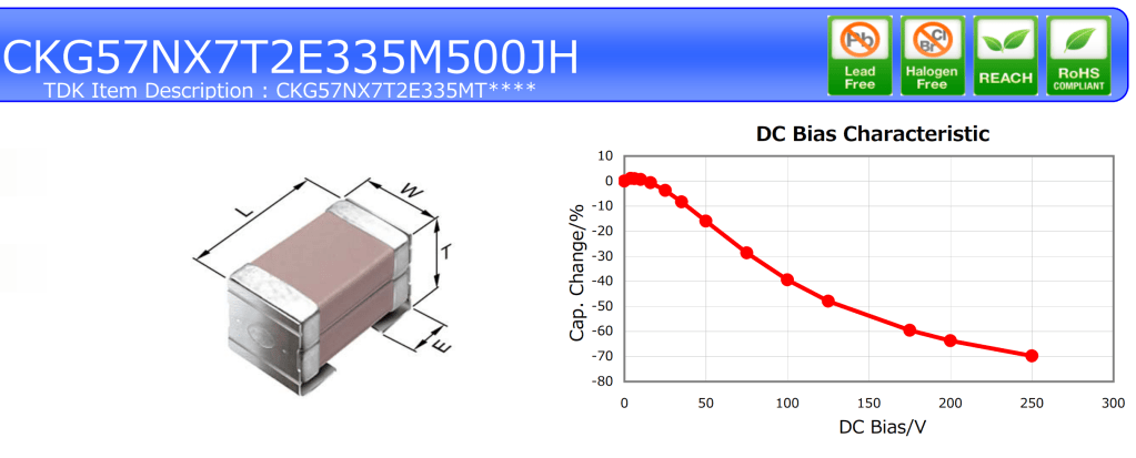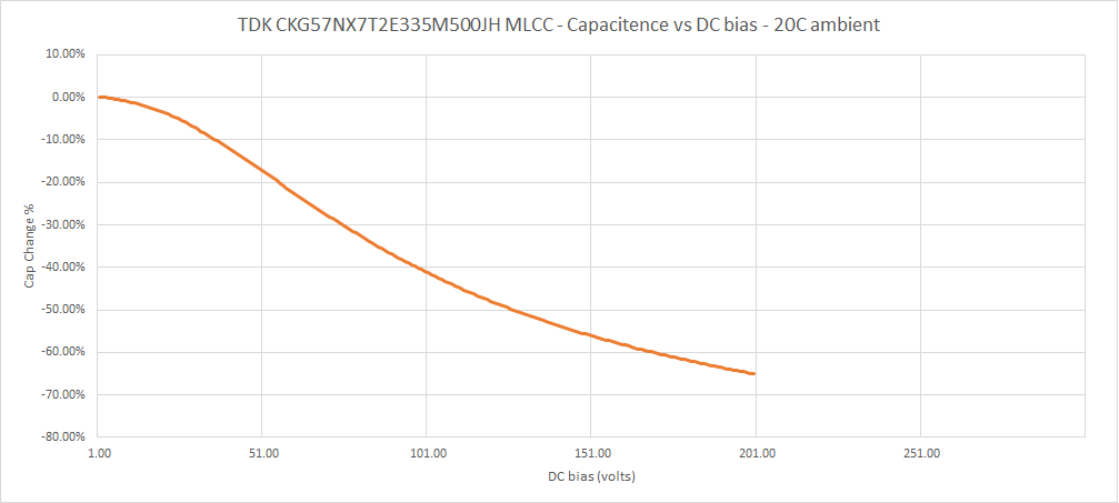 Time to test a part! I chose to test a 250 volt, 3.3uF rated X7R ceramic capacitor, TDK part #CKG57NX7T2E335M500JH. I use high voltage caps like these often in my nixie tube power supply designs, and always wondered what kind of capacitance they had left at 180-200 volts. An important property of ceramic capacitors to remember is that the actual capacitance decreases significantly as the DC bias across the cap increases.