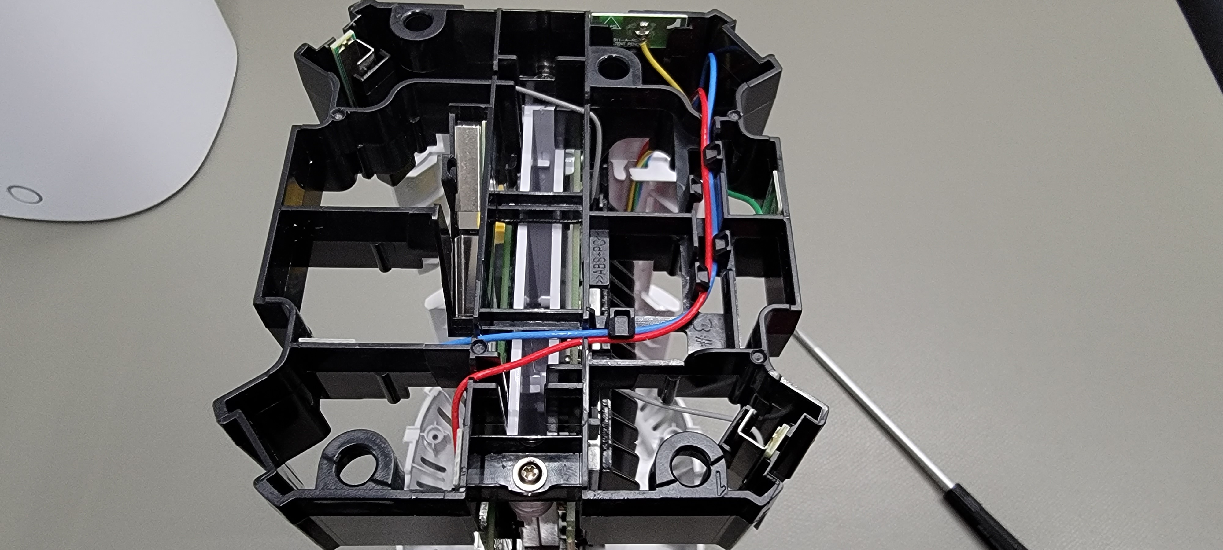 The construction becomes immediately obvious. We have the black antenna mast at the top, and two PCBs with board-to-board interconnects sandwiched around a structural plastic chassis.