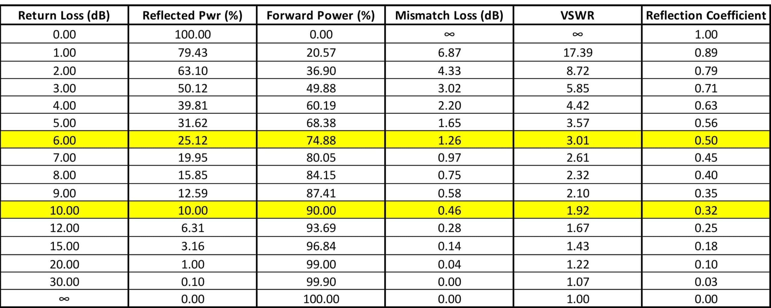 For reference, here is a table which represents the return loss vs percent reflected/forward power. A return loss of 15 dB means that nearly 97% of the power sent to the antenna is being forwarded, and the remaining 3% is reflected back due to impedance mismatches and other nonidealities in the system (connectors, cables, antenna itself).