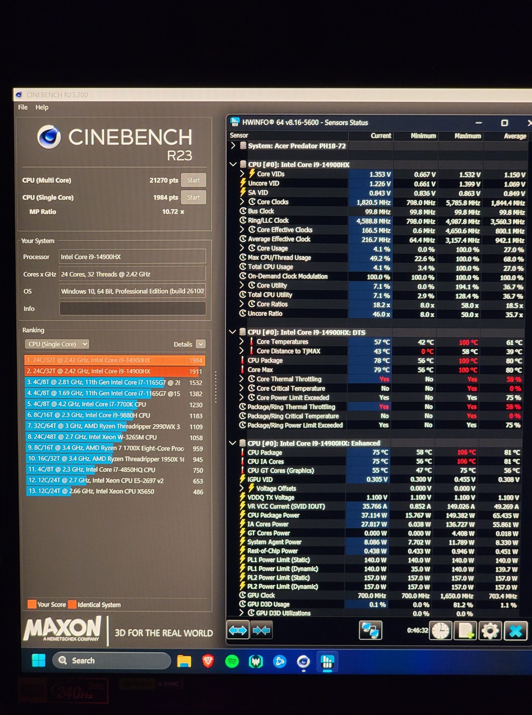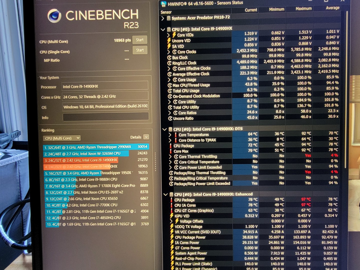 The machine is an Acer Predator Helios 18 (PH18-72-93VM), which comes equipped with an Intel 14900HX and Nvidia RTX 4080 mobile GPU. This CPU/GPU combo has TDPs of 55 and 175 watts, respectively. That’s a lot of heat being generated in a small package.