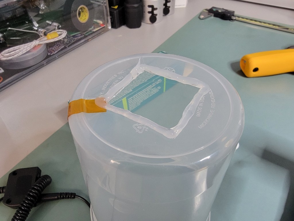 To keep it simple, my plan was as follows: cut a square hole in the container and fasten it to the heatsink with double sided adhesive (3M VHB). Use a good quality neutral cure RTV silicon (Dow 737) to seal the square cutout.