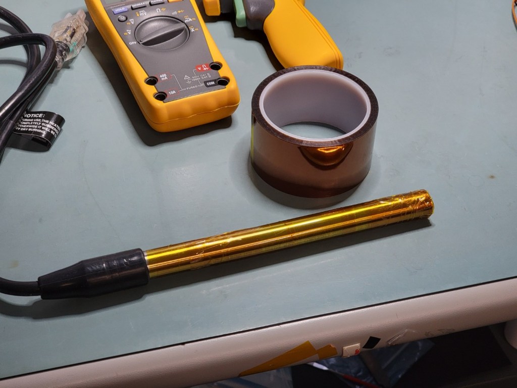 I wasn’t sure if the hot plate would have enough heat transfer to keep the entire electroless bath near 90°C. I looked around for submersible heaters and found a 1500 watt, 120 volt heater on Amazon. I wrapped the stainless heater body tightly with kapton to keep it out of direct contact with the plating solution.