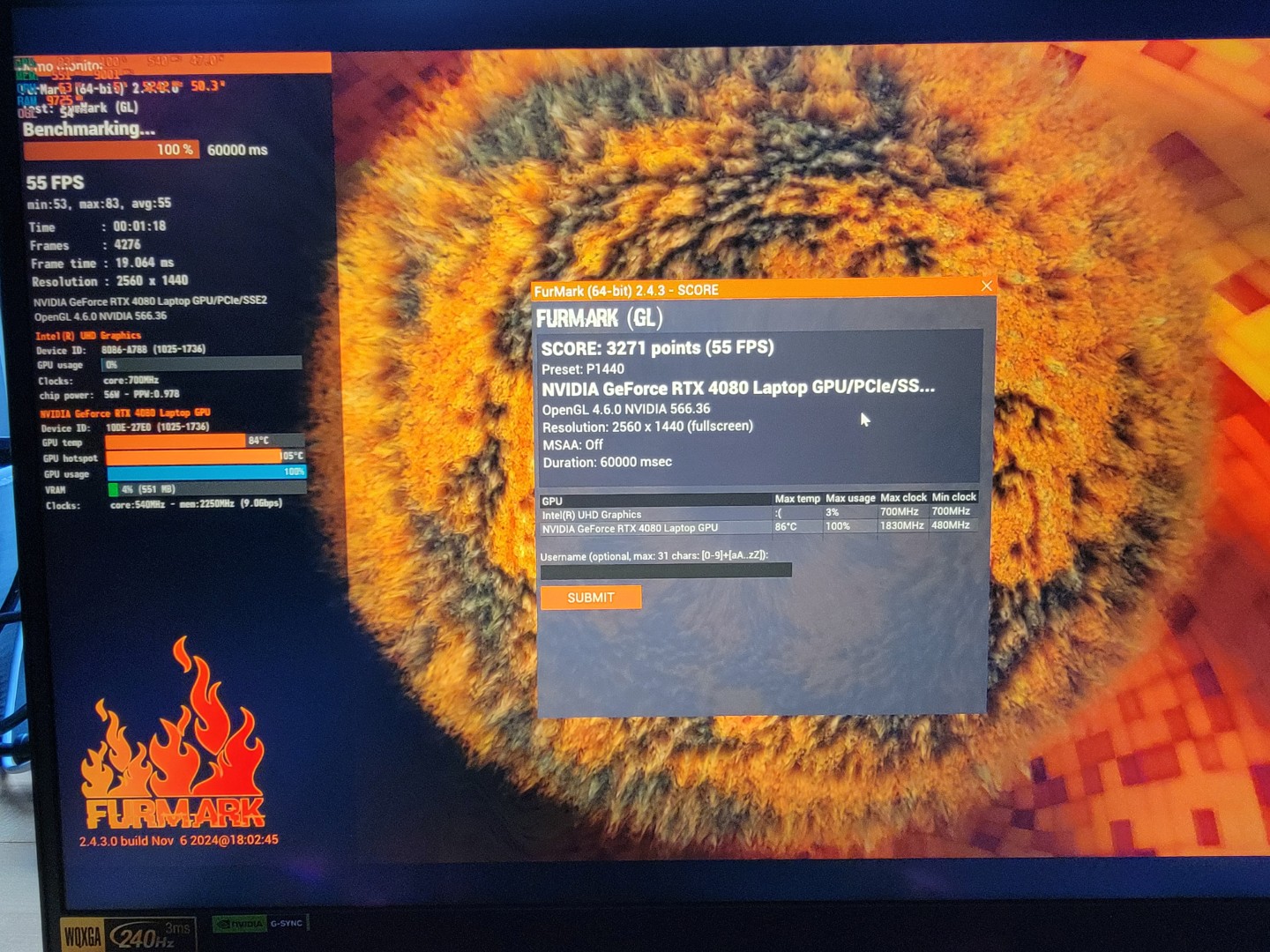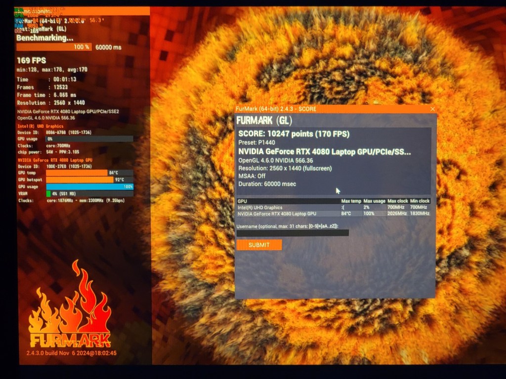 With 58% core thermal throttling, it is clear that the 14900HX is slamming into its thermal limit very frequently. The RTX 4080 seemed to be performing better, achieving its 175 watt TDP with core and hotspot temps within reason.